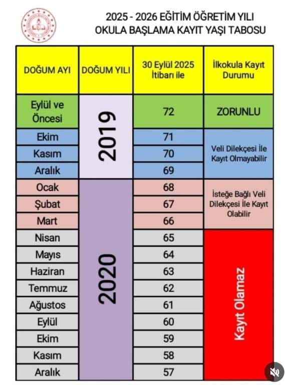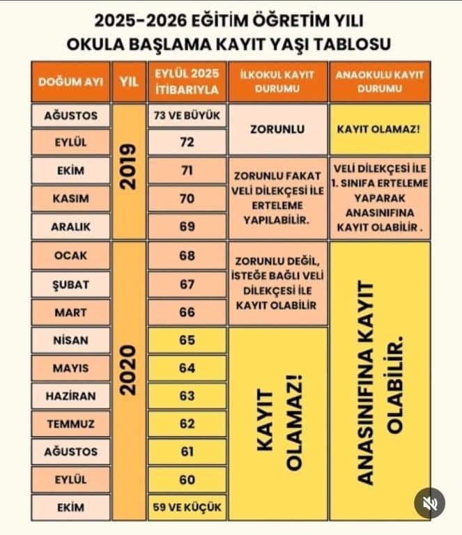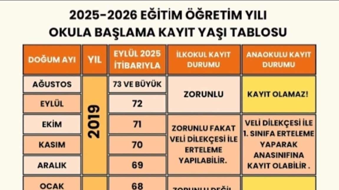 2025-2026 EĞİTİM-ÖĞRETİM YILI OKULA BAŞLAMA KAYIT YAŞI